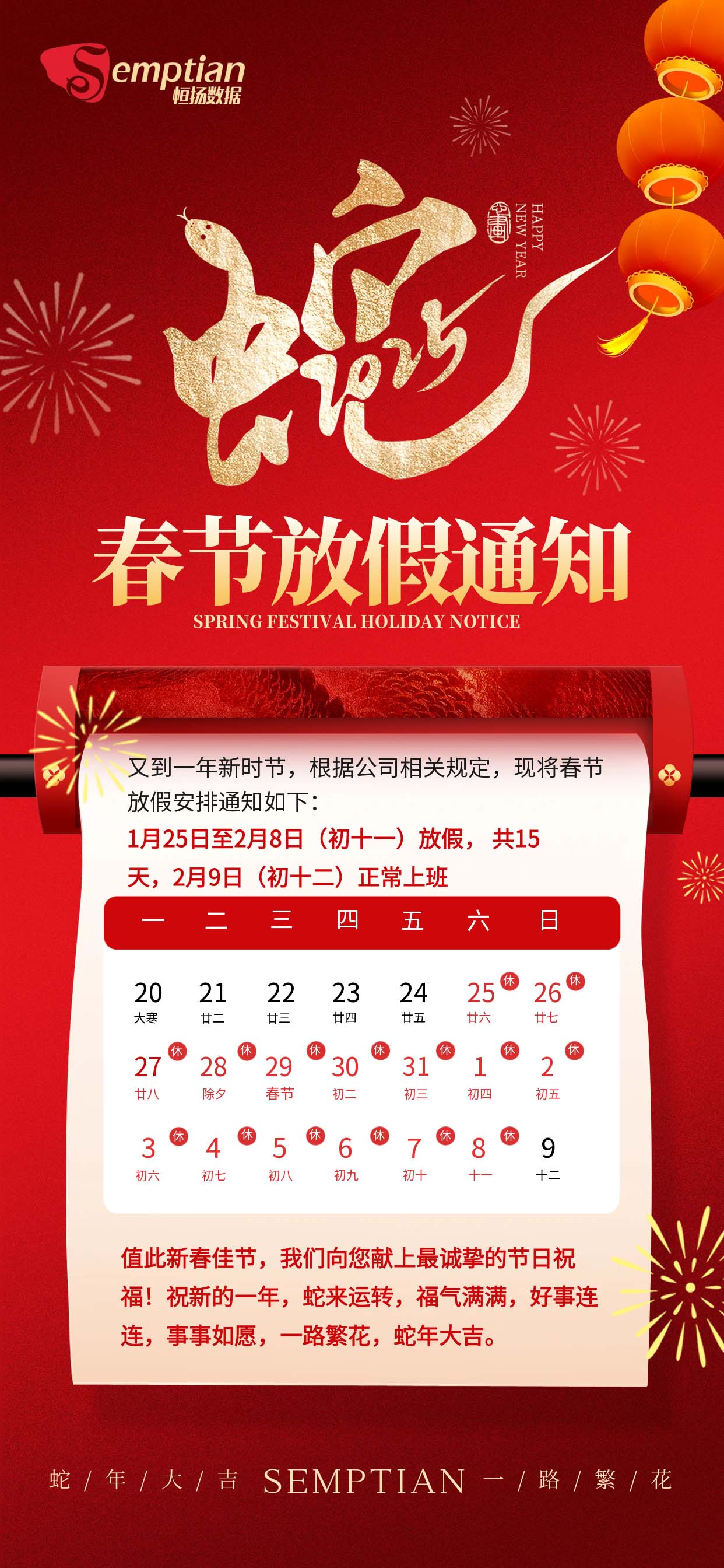 返回列表春節(jié)將至,根據(jù)公司相關(guān)規(guī)定,現(xiàn)將春節(jié)放假安排通知如下:1月25日至2月8日(初十一)放假, 共15天,2月9日(初十二)正常上班。值此新春佳節(jié),我們向您獻(xiàn)上最誠摯的節(jié)日祝福!祝新的一年,蛇來運(yùn)轉(zhuǎn),福氣滿滿,好事連連,事事如愿,一路繁花,蛇年大吉。